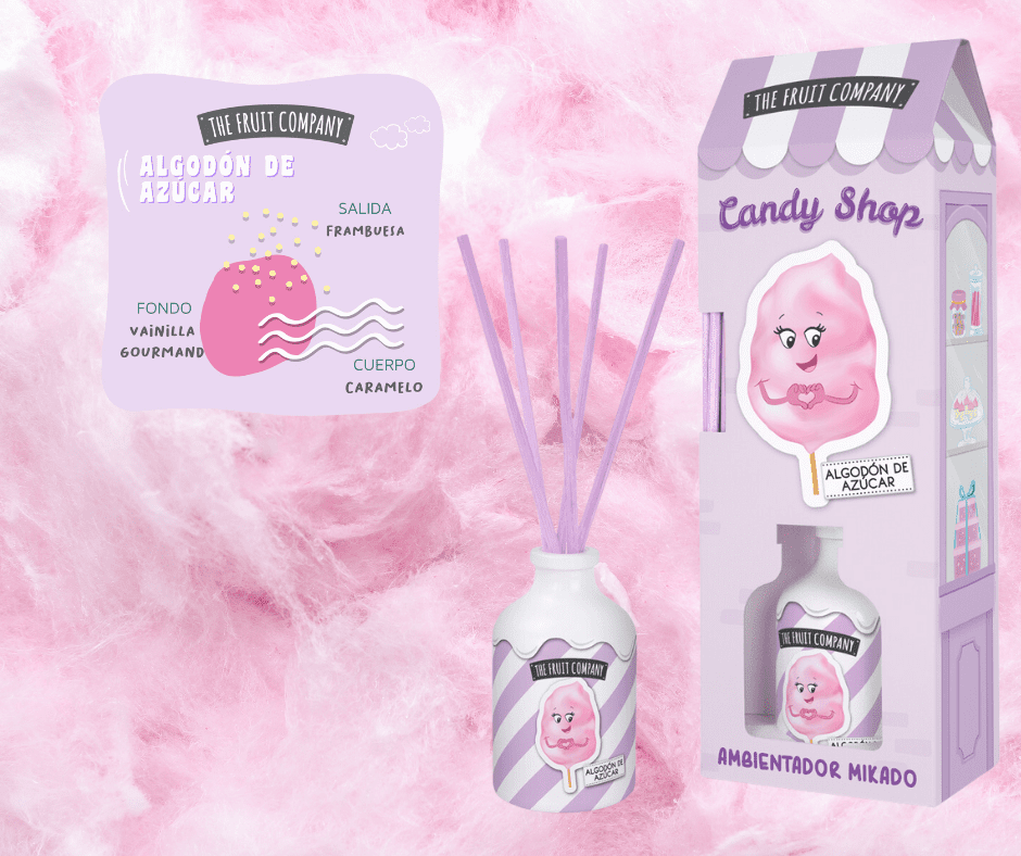 ¡Endulza tu hogar con el delicioso aroma de Algodón de azúcar! Descubre el Ambientador Mikado Algodón de Azúcar Candy The Fruit Company de varillas perfumadas. Con su presentación de 40 ml, este dulce ambientador con extractos naturales, llenará tu espacio con una fragancia irresistible durante más de 60 días. Dale un toque mágico a tu hogar con el Mikado Algodón de Azúcar y deja que su aroma te transporte a un mundo lleno de dulzura y felicidad. ¡Disfruta de su encanto azucarado en cada rincón de tu hogar. Notas de salida a ácida frambuesa que se encuentran con un corazón de dulce caramelo y fondo a irresistible vainilla gourmand para conseguir una fragancia que te traslade a tus recuerdos más tiernos.
