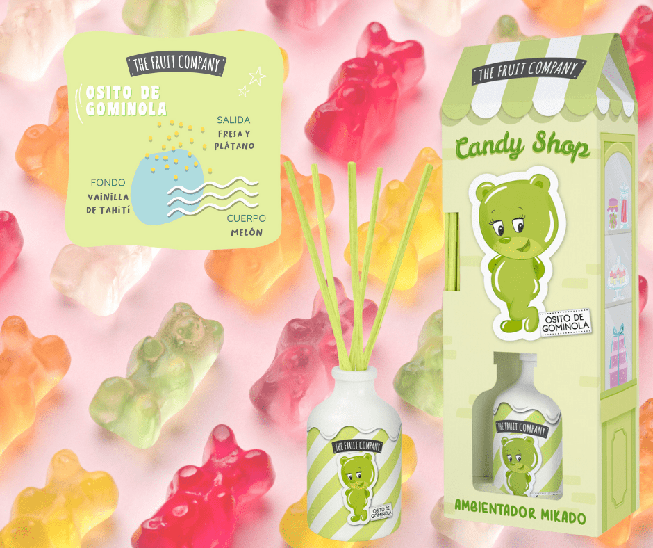 ¡El Ambientador Mikado Osito de Gominola Candy Shop de The Fruit Company es simplemente irresistible! Con extractos naturales, fórmula 0% alcohol y una duración de más de 60 días, llenará tu hogar del tierno, dulce e irreconocible aroma de tus golosinas favoritas. ¡Déjate llevar por su dulzura y crea un ambiente acogedor con este ambientador único! Un mix frutal a plátano y fresa que acompañado de un corazón de melón con notas florales a jazmín, se mezclan con la exótica vainilla de Tahití para crear una fragancia de una dulzura única.