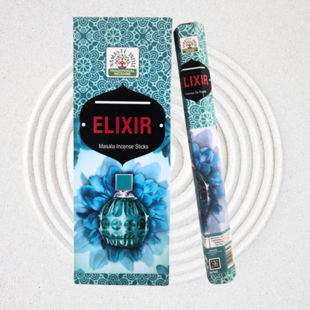 El incienso Elixir se percibe como equilibrado entre lo floral y lo amaderado, con un fondo cálido y ligeramente dulce. Evoca tranquilidad, pureza y armonía interior, ideal para sesiones de meditación, yoga o simplemente para relajar el ambiente. Notas de salida: flor de loto y jazmín blanco que aportan una sensación fresca, ligera y floral. Cítricos suaves: un toque limpio y ligeramente dulce que equilibra el inicio. Notas de corazón: Sándalo y ámbar que dan calidez y profundidad, con un tono maderoso y envolvente. Resinas naturales (benjuí o copal): aportan un matiz resinoso y espiritual, típico de los inciensos rituales. Notas de fondo: Vainilla y almizcle blanco que dejan una sensación cremosa, suave y reconfortante. Un leve toque de pachulí: redondea el aroma con un matiz terroso y meditativo.