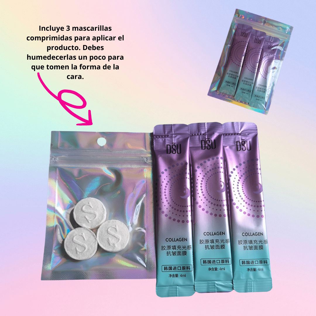 Set de 3 mascarillas faciales coreanas de colágeno. Las principales propiedades para la piel de estas mascarillas son: elimina las líneas de expresión y arrugas superficiales, aumenta la elasticidad de la piel e hidrata el rostro en profundidad. Contiene 3 mascarillas comprimidas desechables para aplicar el producto de forma más cómoda. Humedecer la mascarilla compacta con un poco de agua para que obtenga la forma de la cara.