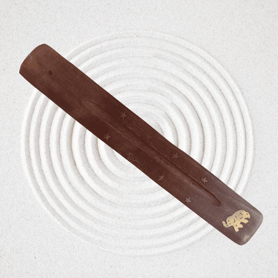 Tablilla porta incienso en madera con incrustación metálica en forma de elefante, luna, símbolo de la paz o pica.
