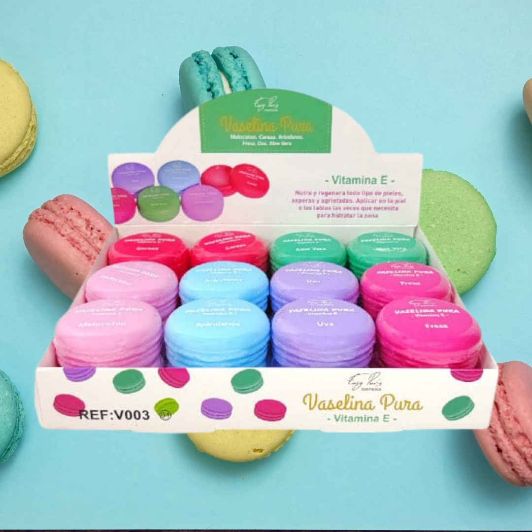 Preciosa vaselina pura con forma de macaron que nutre y regenera todo tipo de pieles, ásperas y agrietadas, gracias a la vitamina E.